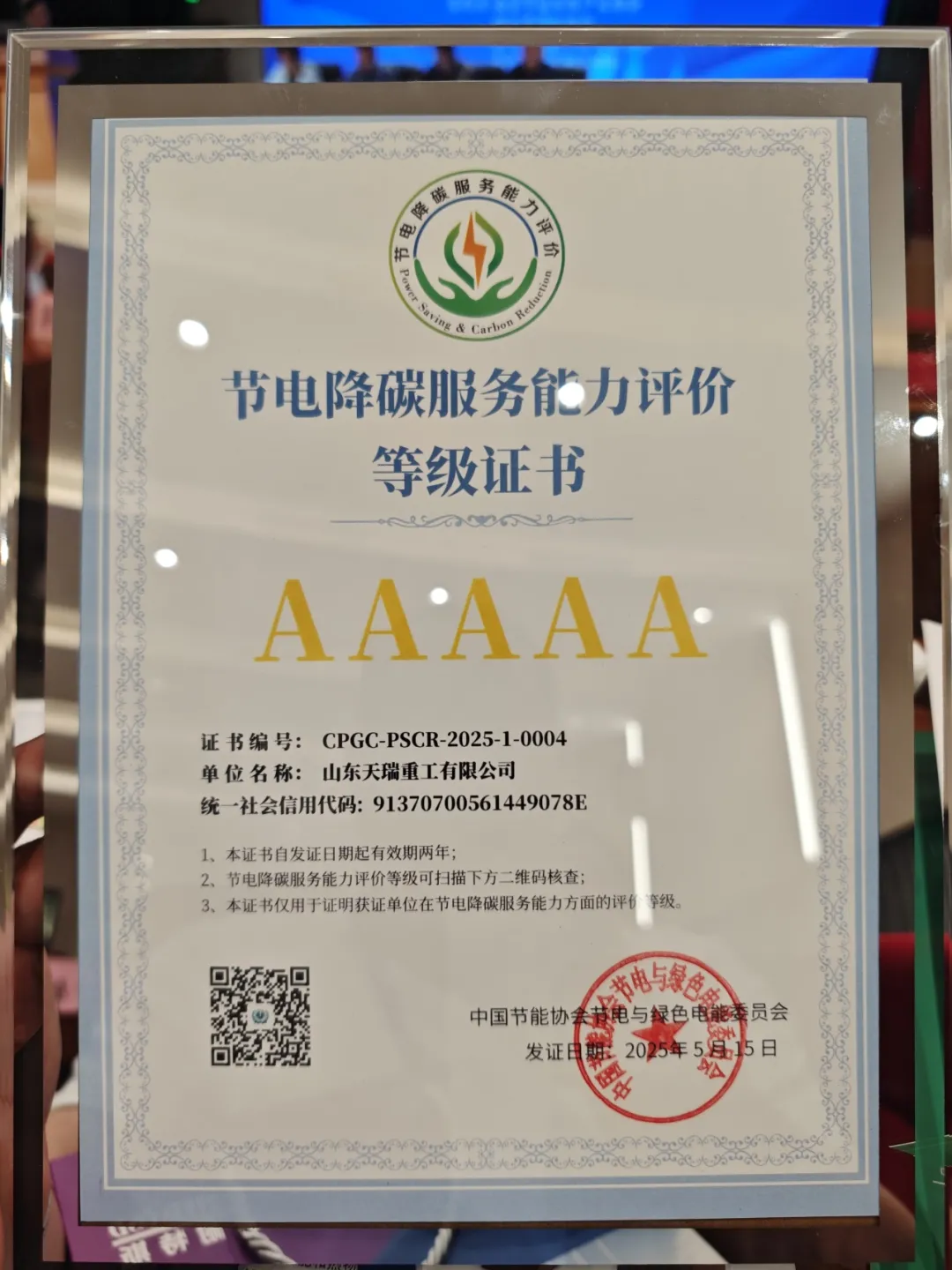 活动期间,天瑞重工荣膺“2025年第 一批节电降碳服务能力评价AAAAA级单位”称号!该认证由权威机构及专家评定,从技术研发、项目落地、碳减排成效等多维度综合考核,再次肯定了天瑞重工在绿色服务领域的突 出贡献和领 先地位。